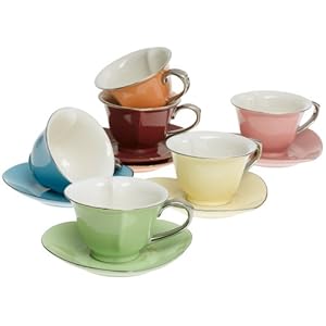 Coffee? Tea? Love? This set of cups and saucers was a Valentine's Day gift for my daughter. From the heart shaped saucers to the platinum trimmed cups, this set is just so pretty. The colors are so much fun - you can either match them or mix them up - they look good either way. But the true delight comes when you realize the inside of the cups are shaped "just so" - when you pour in the coffee or tea, the loveliest heart shape becomes evident.